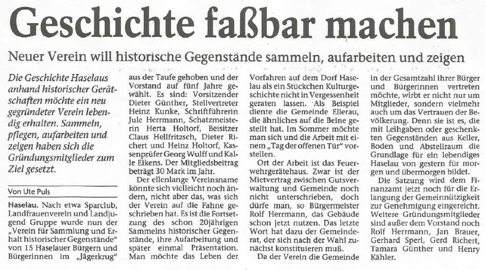 Aus der Verantwortung und Verpflichtung heraus, das kulturelle Erbe unserer Gemeinde zu erhalten, versammelten sich um 17.3.1998 15 Bürger der Gemeinde Haselau in der Gaststätte "Jägerkrug", um den "Verein für Sammlung und Erhalt historischer Gegenstände" zu gründen. Zum Vorsitzenden wurde Dieter Günther gewählt.